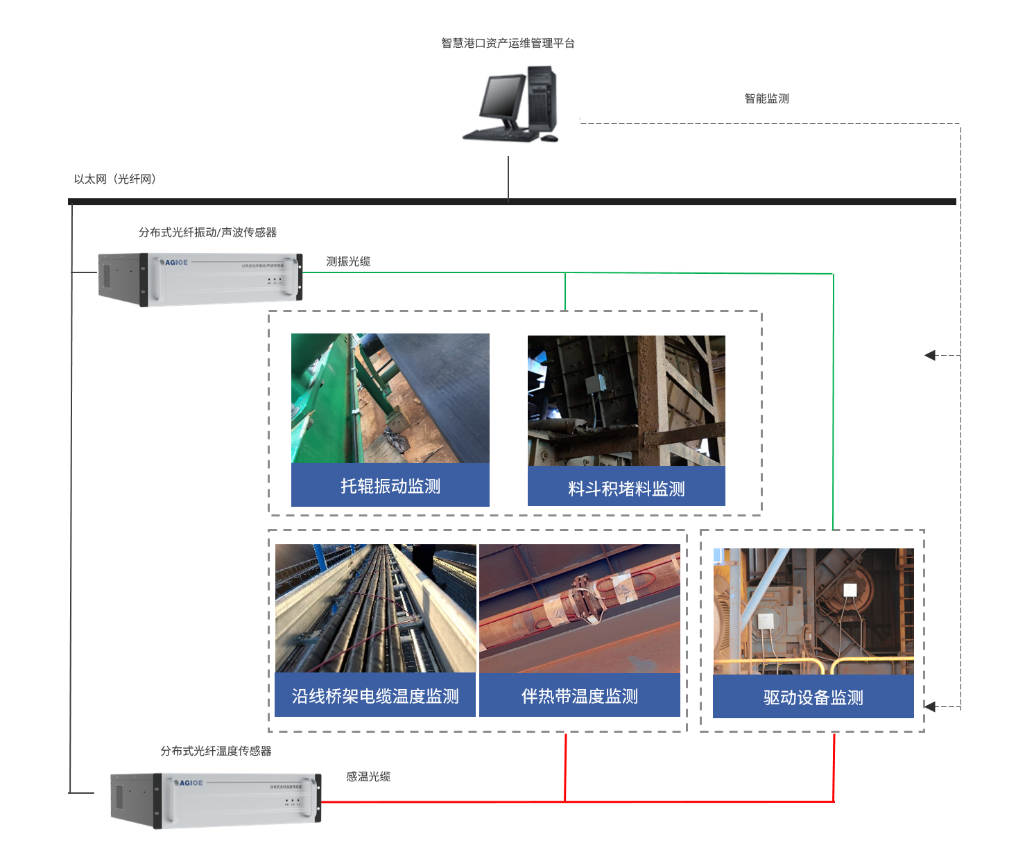 散貨碼頭皮帶機作業(yè)中,托輥、驅動(dòng)設備異常、料斗積堵等故障頻發(fā),傳統人工巡檢效率低下、響應滯后,嚴重影響運輸連續性。光格科技通過(guò)分布式光纖振動(dòng)